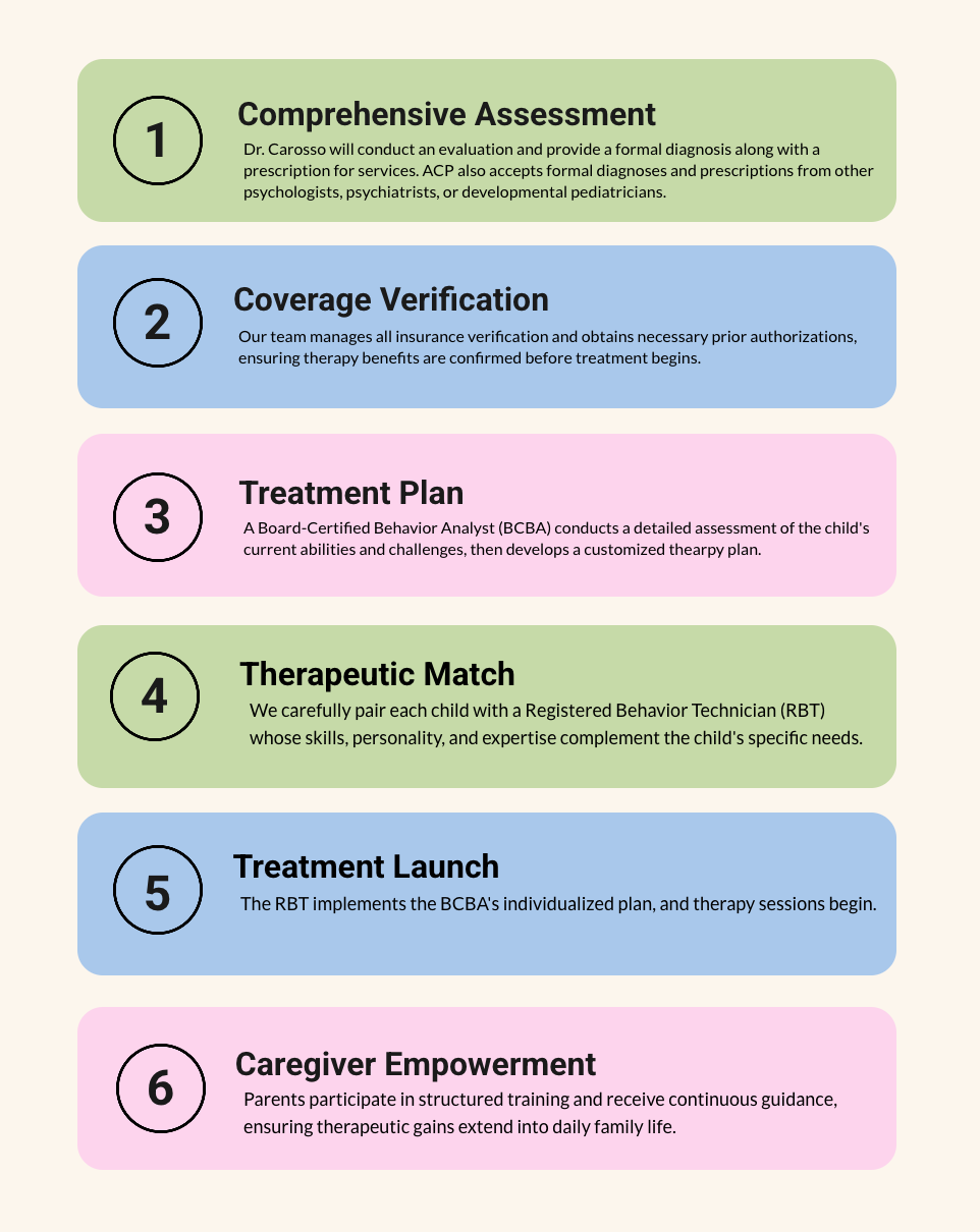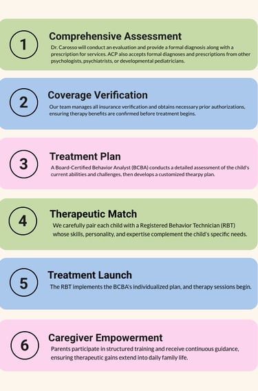 Dr. Carosso will conduct an evaluation and provide a formal diagnosis along with a prescription for services. ACP also accepts formal diagnoses and prescriptions from other psychologists, psychiatrists, or developmental pediatricians.